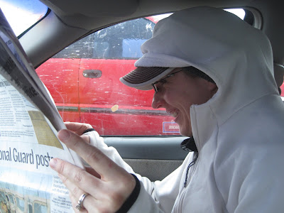 We got to the registration and number pickup area and I would swear the rain started falling harder from the sky, luckily they had a small covered area to pick up number, but they were not well organized. I love the shirts we got though. After we registered we had to find the parking area by the starting line, again not real organized and was a little confused as to where we had to go. The website said the race started at 9:30 and the sign at the race said 10:15 and the organizers there said 10:00?! We found the parking lot after a little driving around and sat in the car for 40 minutes watching the rain come down in torrents.