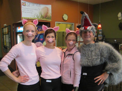 I ran a fun run today and had a lot of fun. I ran with another nurse that I work with, her husband and one of her friends. We were the three pigs and the big bad wolf. We won the best costume prize. You can't see it but we also had little piggy tails on. Dwight, the big bad wolf, chased us the whole way. We finished in 25:10. Not bad for just running it for fun. The weather was a perfect 48 degrees with a slight wind.