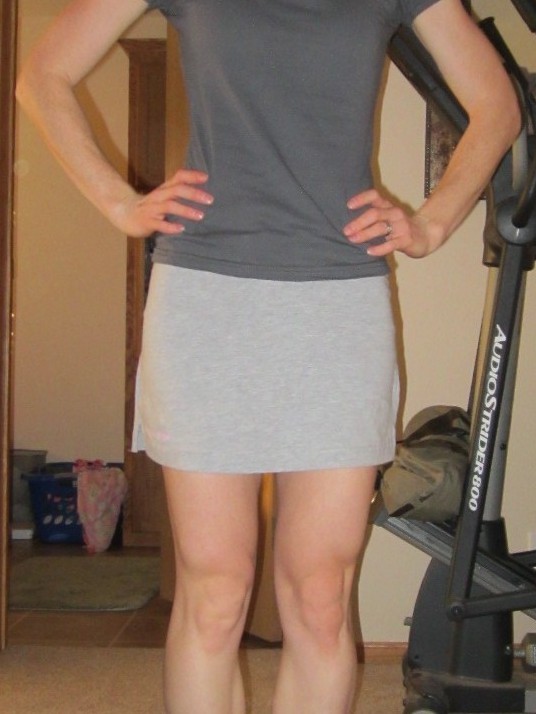 I got this great skirt, but I could not seem to take a great picture of my face while wearing it so I cropped my head out of all the pictures. They were that bad! Skirt is cute and super comfy with little shorts underneath. I would wear them for shorter runs and did wear it today to do a BodyRock workout.