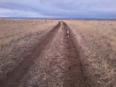 Out of the field the roads weren't too bad. Here is Cola again wondering what in the world I have stopped for again. Seems like I stopped a hundred times to shed clothes, get rid of rocks, take pictures, open gates, drink some water, stretch, eat some chomps and on and on.