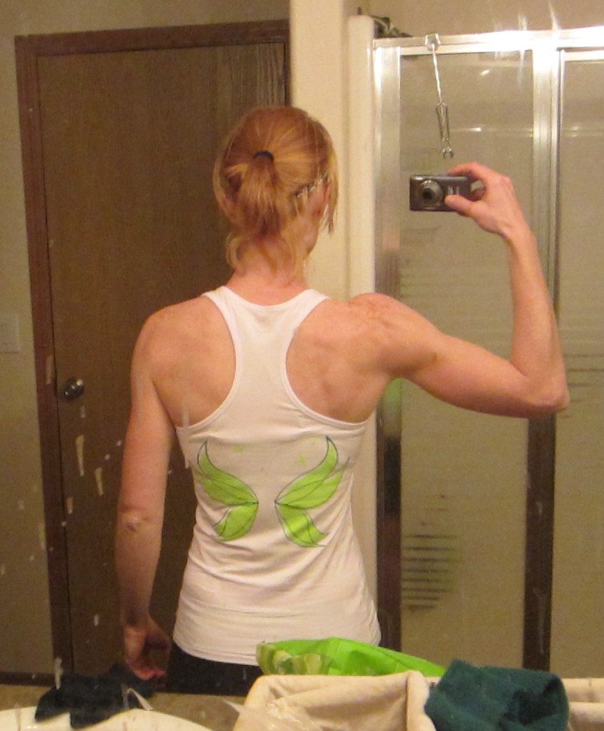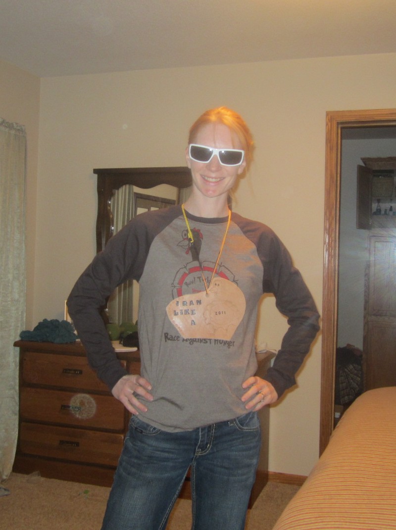 I seriously love the shirt, it is nice and long in the arms and the body, I love the colors. Oh yeah and did you notice my "medal" for winning the girls mile race? It is made out of a scrap of leather. Very original!