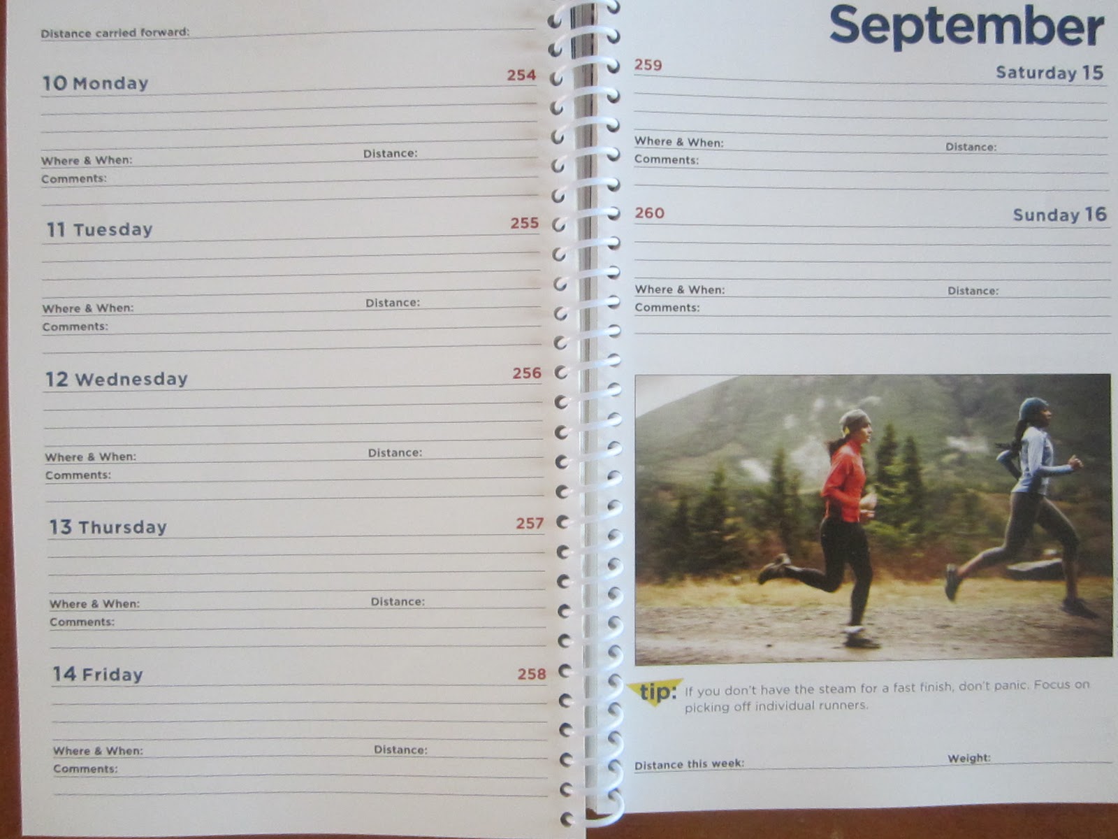 Here is what is looks like on the inside. It is full of quotes and advice. I use the Dailymile but I really like writing things down too and having it in my hands when I want to review something.