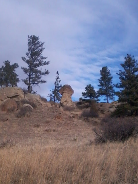 Here is what I stopped to take a picture of. There are lots of these rocks on my family's ranch and we had so much fun playing on them while growing up. I always thought this one was really cool because it looks kind of like an Egyptian pharaoh. Like it could be in front of a pyramid or something.