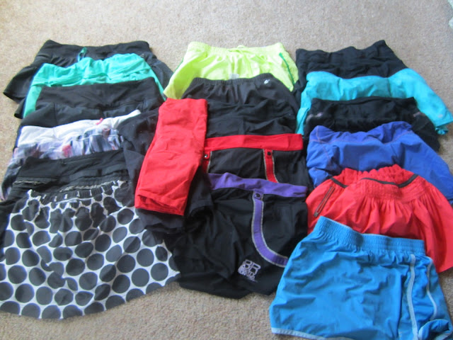 Bottoms. I love wearing skirts to run in...Lululemon makes my favorite, I think I love them most for the little shorts they have underneath that do not ride up. I also have Aspaeris compression shorts, Bibbity skirts, and shorts from UnderArmour, Fila, and Asics.