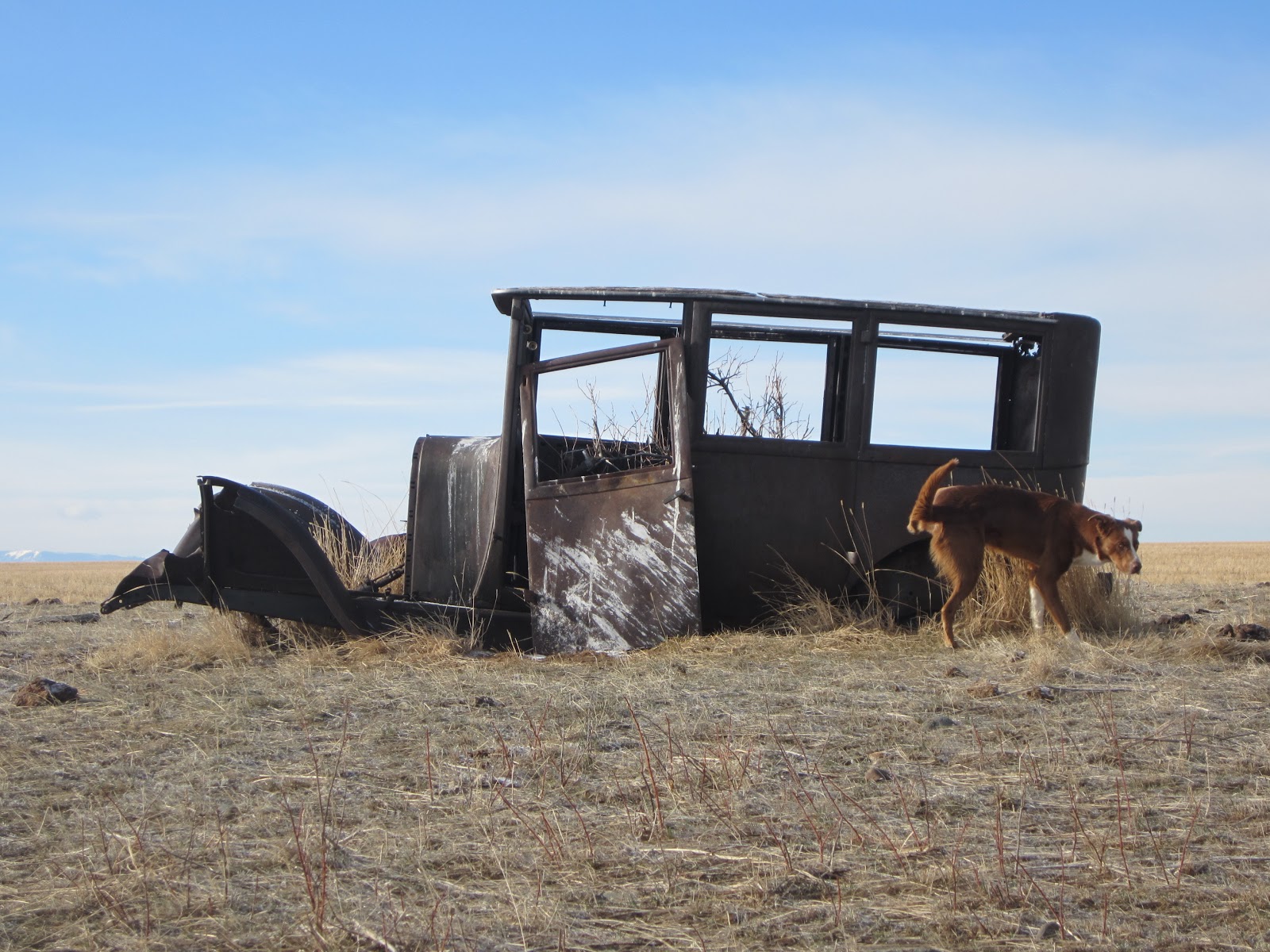 This old relic is from another time. It sits along with some other old vehicles along the edge of the field. Abandoned there before my family owned the place. You can see Cola was impressed by it.