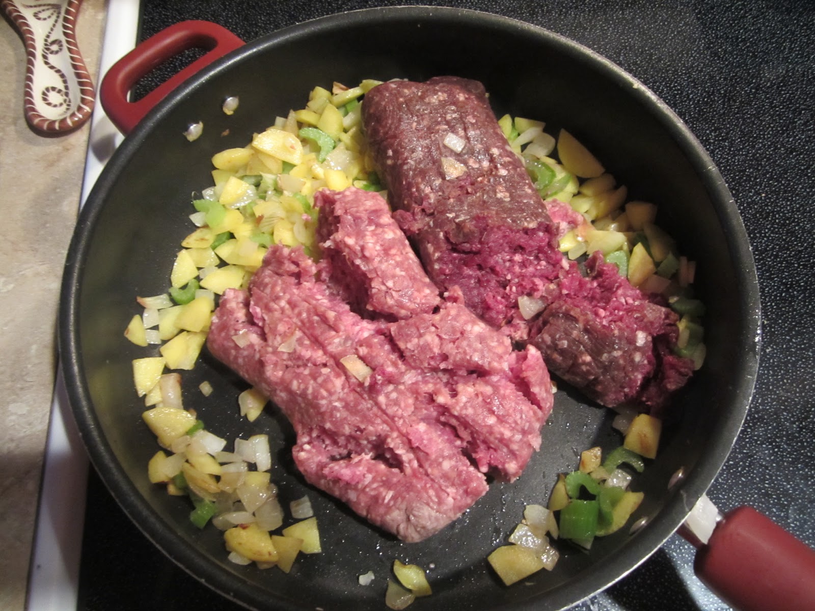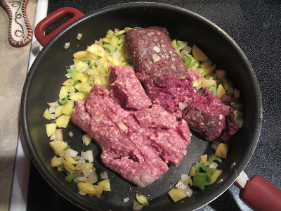 Once the vegetables were "sweated" like the directions said I added the ground beef and ground elk. Okay the directions didn't call for elk, but I like to add it in too sometimes since I have some in the freezer and its good and you can't really tell the difference in the final product. Oh look at that I also sauted/sweated a parsnip in there too. (I like to improvise a lot when I cook)