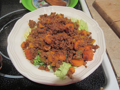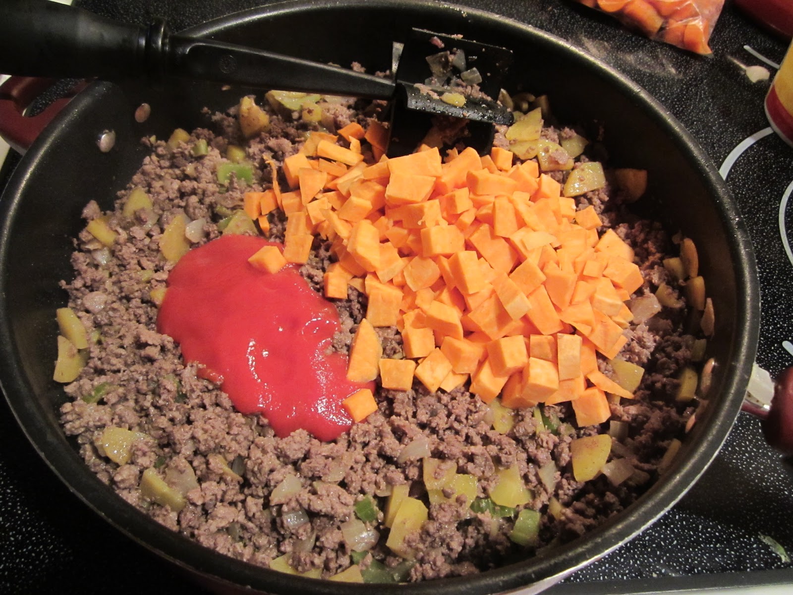 Once the burger finally got brown I added the tomato sauce and sweet potato, also the carrots.