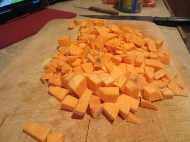 While the burger is browning I chopped up a very large sweet potato. I was also catching up on the Bachelor on my iPad, which is the red thing in the corner.