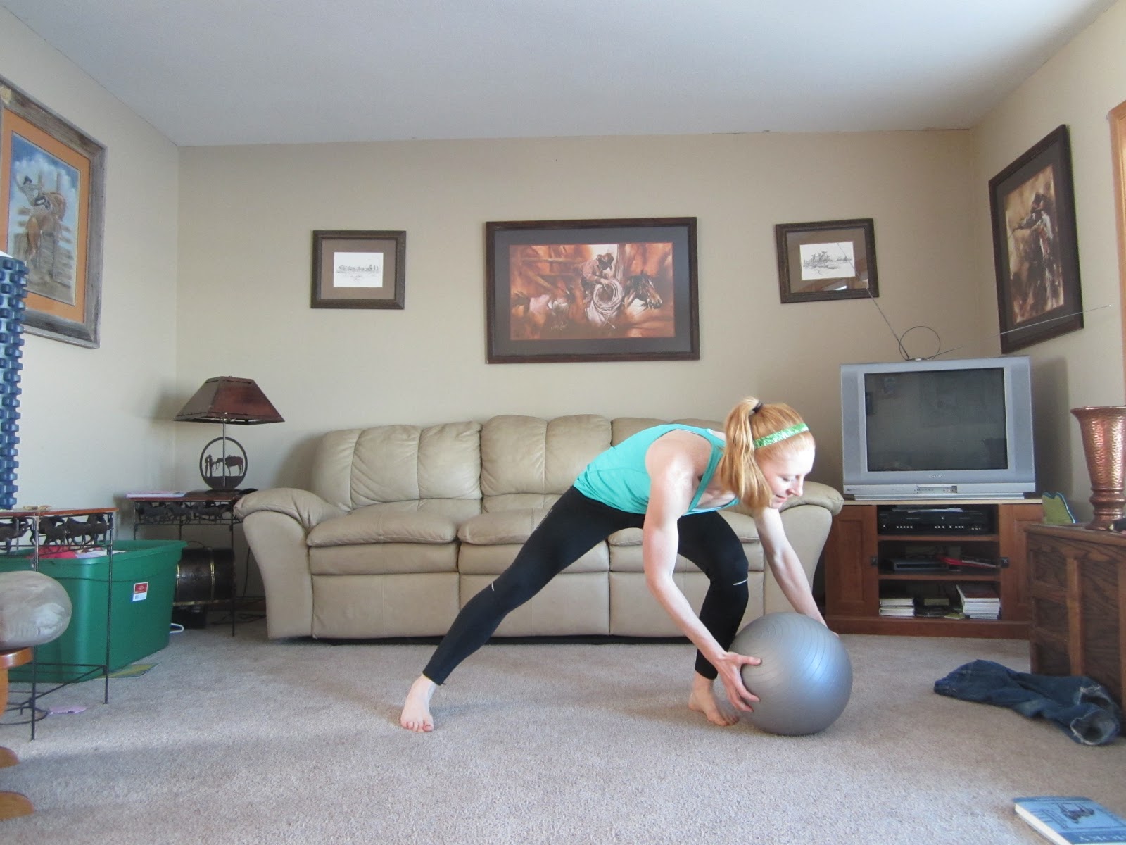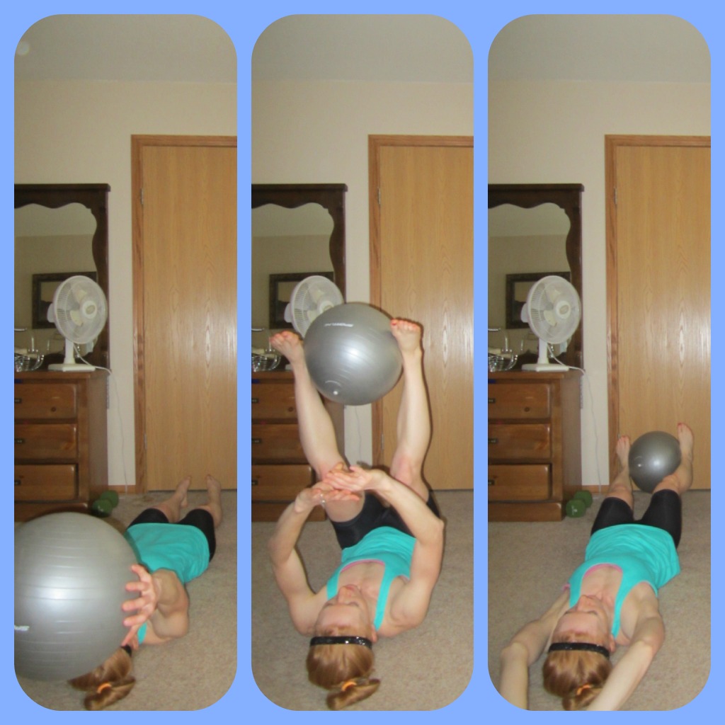 stand up, lift the ball and twist over to the side. Repeat. Great exercise.