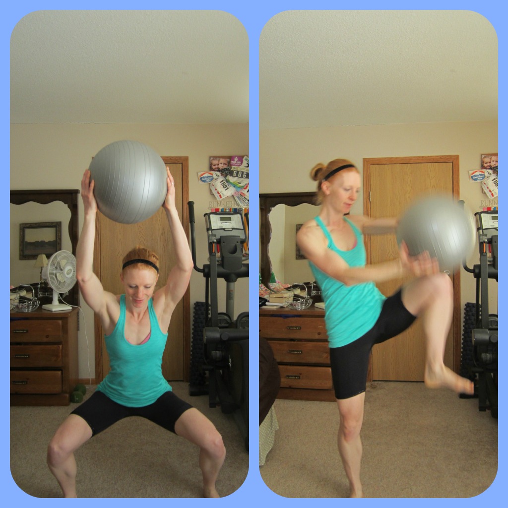 Sumo squats with knee up and ball to the knee. These really work the shoulders.