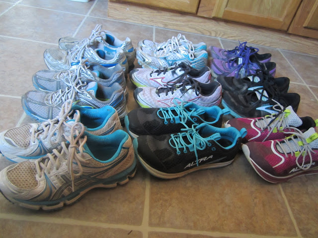 Let's start at the bottom..shoes! Currently running in 1 pair of Asics, 2 pairs of Mizunos, 2 pairs of Altras, 3 pairs of Brooks although 2 are nearly retired and 2 others I can't show you because they are wear test shoes for someone. I did actually throw out a pair this week. That almost never happens!