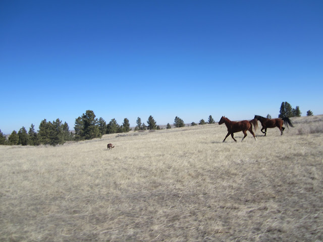Cola even had a little excitement getting chased by my grandmothers horses when we cut across the pasture they were in. They were pretty curious about him. They ended up running off down the hill into the corral after this, which was perfect since unknown to me and Cola, my grandma had wanted them in.