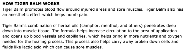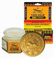 Tiger Balm contains ingredients like oil from clove, wintergreen, spike lavender, eucalyptus, cinnamon, and cajuput, as well as camphor, capsicum and condroitin sulfate which all work together to help relieve sore muscles and joints.